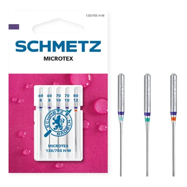 De Schmetz Microtex naald heeft een bijzonder scherpe, slanke punt en kan daardoor gemakkelijk door zeer fijn of dicht weefsel dringen. De naald is geschikt voor het naaien van zijde, microvezel, folies, synthetische vezels en gecoat materiaal en maakt indruk door de bijzonder rechte steken. De naalden zijn geschikt voor huishoudelijke naaimachines en hebben een platte achterkant. Iedere verpakking Schmetz Microtex bevat 5 naalden